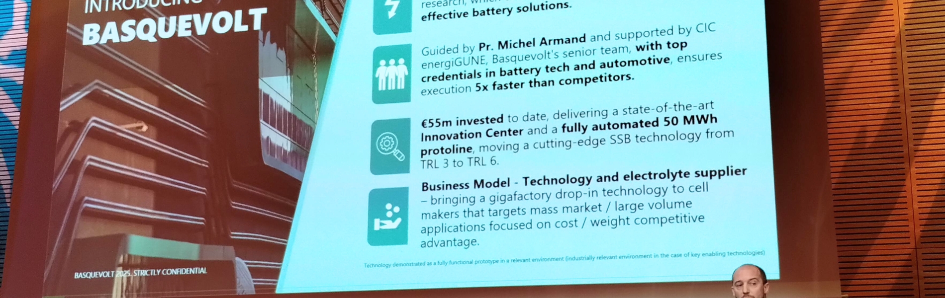 Ayer, nuestro Director de I+D y CTO, Vincent Giordani, participó como ponente en el evento Batteries Event 2025 celebrado en Lyon, Francia. Durante su presentación, presentó el proyecto de BASQUEVOLT respaldado por el EIC Accelerator ante una amplia audiencia y compartió sus perspectivas sobre las baterías de nueva generación y la tecnología de baterías de estado sólido.